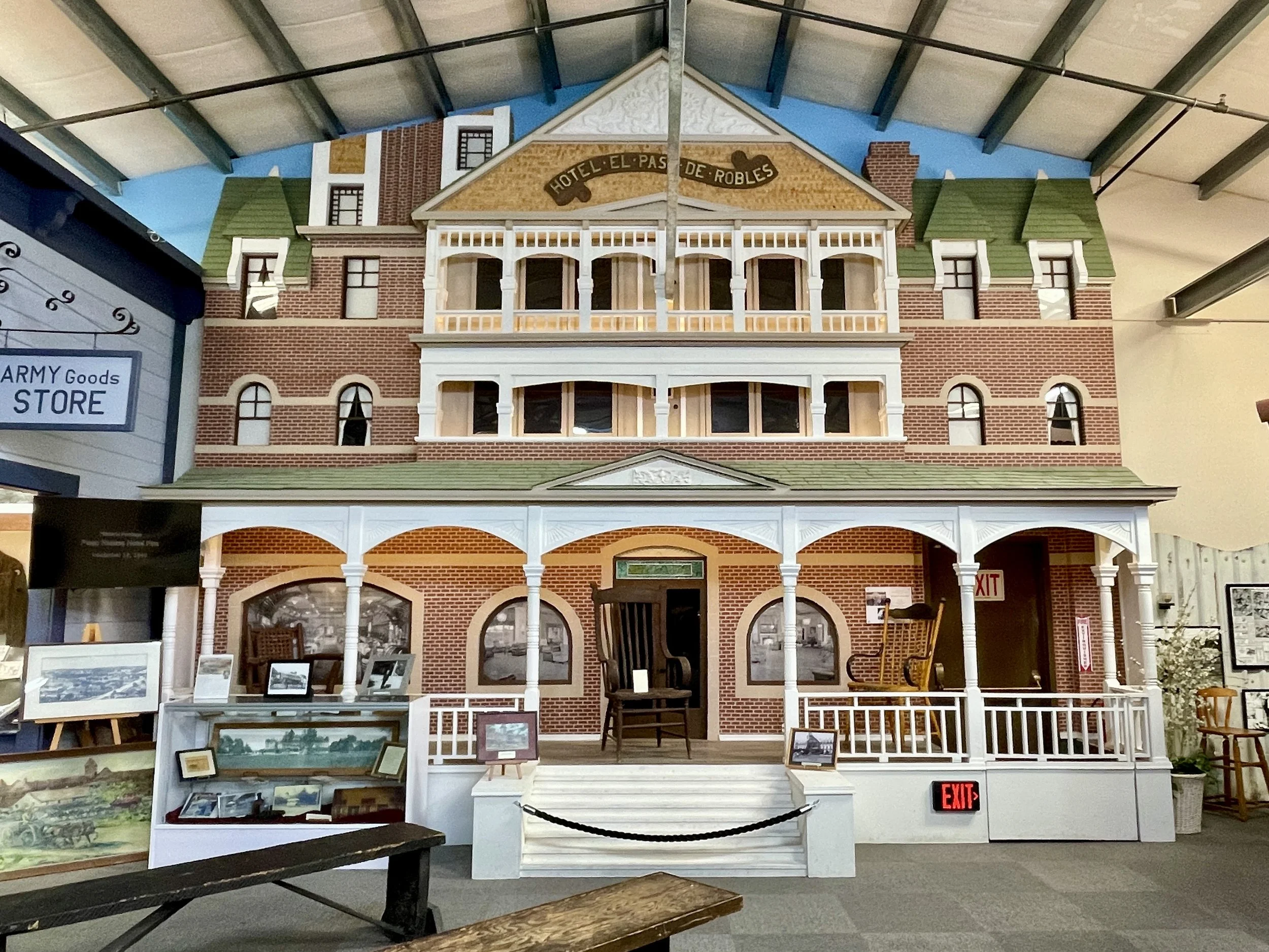 One display you can’t miss as you approach the back of the museum is the large “hotel facade” that dominates the room. A couple of original hotel chairs adorn the porch, and photos and explanations about the hotel fill the nearby display cases. I’m glad to know my great grandmother had the opportunity to experience the hotel in its heyday and that she, too, found joy in visiting Paso Robles. I’m not sure if she visited again after that week in 1939, but I know that Mike and I certainly have plans to return — and maybe next time, we’ll visit one of the hot springs that I now know are still in operation!