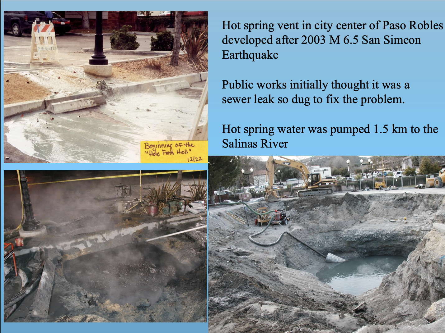 “Paso Robles was founded as a resort town in the late 1800s, and for decades downtown was dotted with hot mineral and mud baths. But as their popularity faded, the baths were closed, the springs covered, sealed, and all but forgotten. That is, forgotten until December’s quake cracked open a deep fissure, allowing 110 degree water to spout from the parking lot at about 350 gallons a minute — enough to fill six Olympic-sized swimming pools a day.” [3]