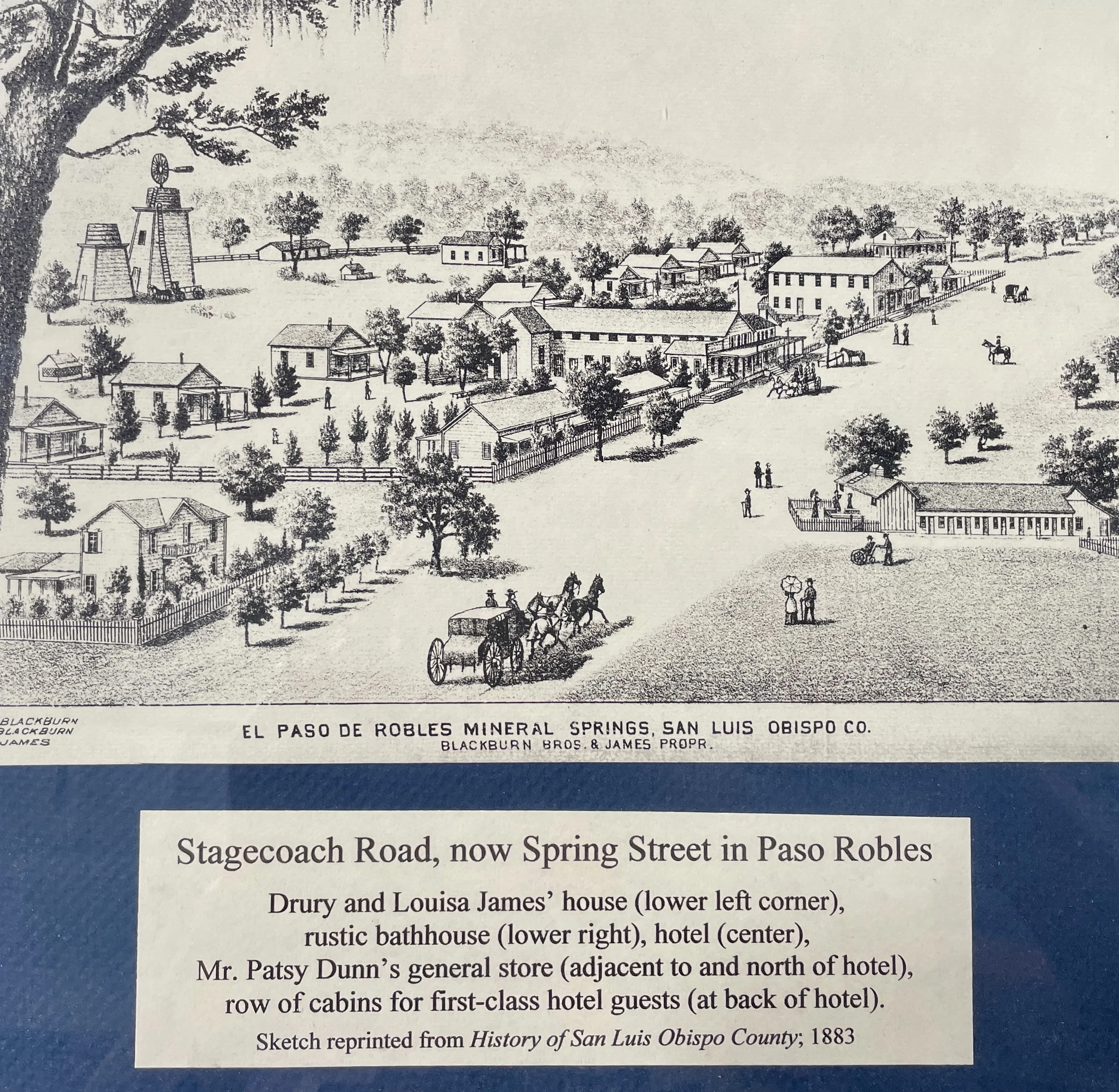 In 1869, Drury James bought a half interest in the Paso Robles hotel and bathhouse and the surrounding 4,300 acres. He also moved to the village that year and began promoting Paso Robles as a health resort. His house appears in the illustration below in the bottom left corner.