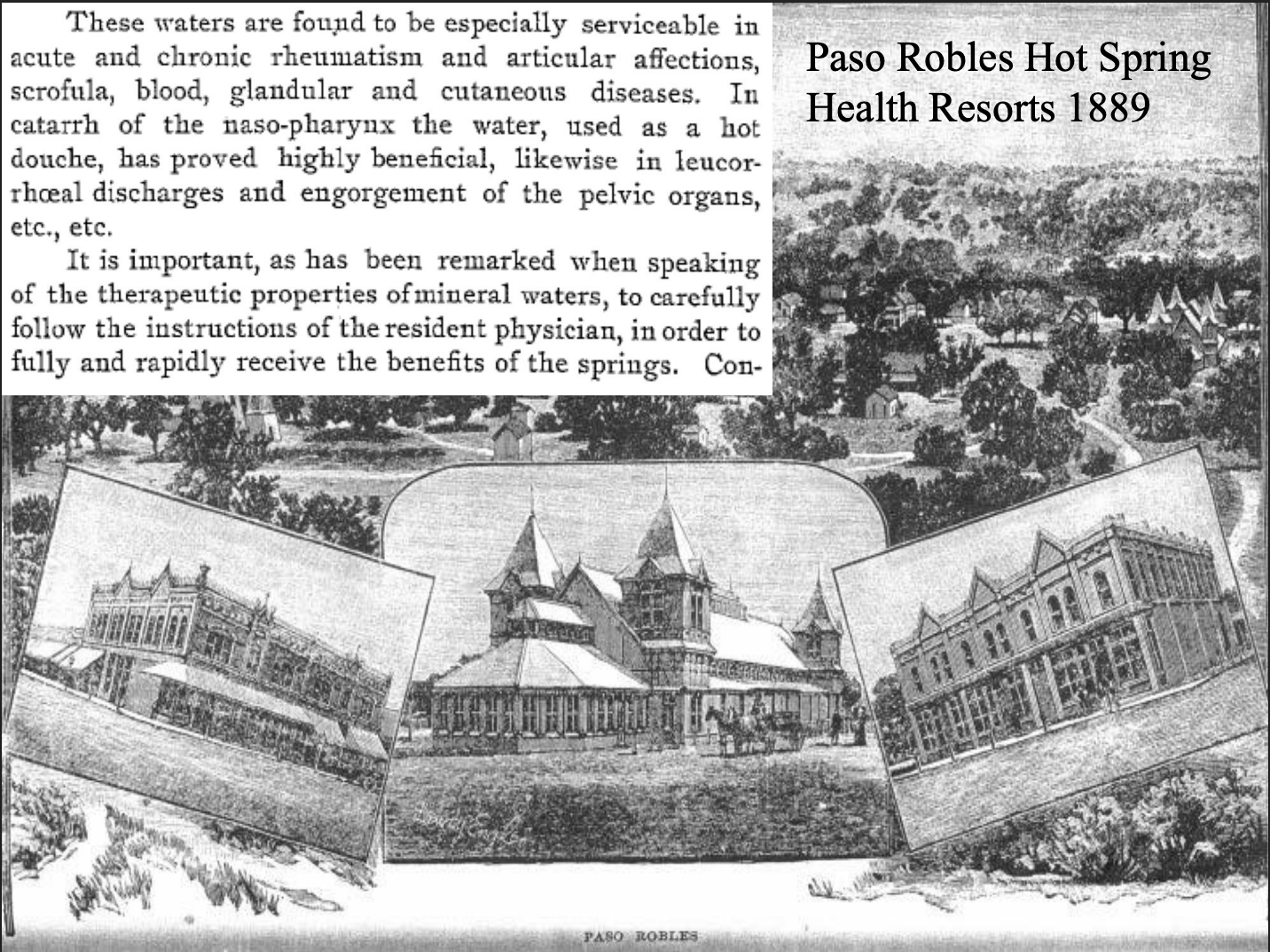 The healing properties of the thermal waters in and around Paso Robles have long been recognized. The native Salinan People utilized both the natural mud baths and warm springs for curative purposes and called the place “Heaven’s Spot.” It was they who introduced Spanish Franciscan padres to these natural hot sulfur springs in the 1700s. As far back as 1795, people spoke and wrote about the location as “California’s oldest watering place,” and by 1868 “people were coming from as far away as Oregon, Nevada, Idaho, and even Alabama. Besides the well-known mud baths, there were the Iron Spring and the Sand Spring, which bubbles through the sand and was said to produce delightful sensations.” [6]